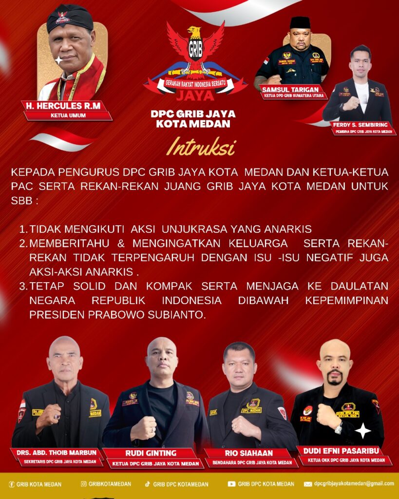Medan – Dewan Pimpinan Cabang (DPC) GRIB Jaya Kota Medan mengeluarkan instruksi kepada seluruh jajaran pengurus, ketua Pimpinan Anak Cabang